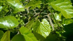 Am Stadtrand von Wusterhausen habe ich die Blütenstände dieses Maulbeerbaumes fotografiert. Die Bäume wurden früher für die Zucht der Seidenraupen angebaut. Heute sind sie leider selten zu sehen. Dabei schmecken die Beeren gut, die ähnlich aussehen wie kleine Brombeeren.